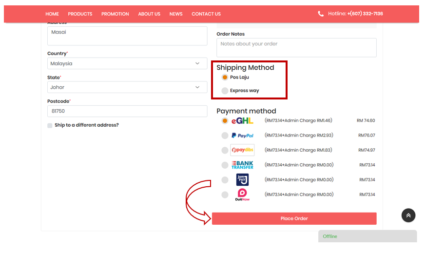 6. Please select your Shipping method and then select your preferred Payment Method, then click the "Place Order" button.